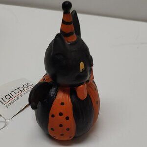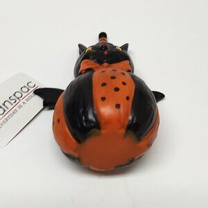 Bat Peep Halloween Pumpkin Peep sitter has flat based pumpkin body painted in Halloween orange, black and white colors with a bat head sporting a tiny little bow tie and Halloween hat perched on his head. Approximate measurements: 4.50" L x 3.00" W x 4.50" H