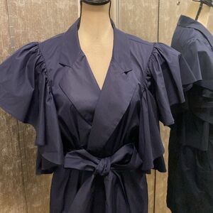 This stunning blue mini dress by Johanna Ortiz features a flattering wrap design with a tie front and a sophisticated v-neckline. The cap flutter sleeves add a touch of elegance, making it perfect for cocktail events or a stylish day at work. New, no tags