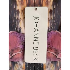 Johanne Beck abstract floral mini skirt featuring a bold mirrored floral and textured print in pink, mauve, and earthy tones. Clean pull-on waistband with a flattering structured silhouette and comfortable stretch. Statement piece perfect for cocktails, nights out, or elevated casual looks. Made in the USA of imported fabric.