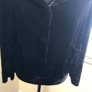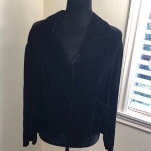 Silk blend material that feels like velvet and hand made in CA. 3 buttons and 2 pockets. Loose fitting