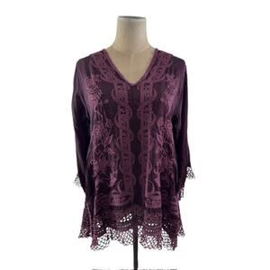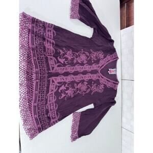 Experience the unique blend of comfort and bohemian flair with the "Johhny Was" Embroidered Tunic Top. Tailored for those who appreciate a regular fit, this size XS blouse is a perfect addition to your wardrobe. Its rich purple hue is complemented by intricate embroidery, showcasing the craftsmanship that Johhny Was is known for. Ideal for the woman who embraces her artistic side, this top is versatile enough to pair with your favorite jeans for a casual day out or dress up with a skirt for an evening event. Be sure to examine the detailed photos to appreciate the unique design and style that this piece has to offerSmall Slice in top of shirt. 27"T x 18"W x 3/4 Sleeve... FINAL SALE!!