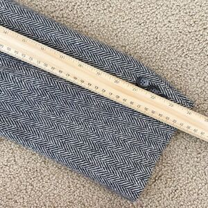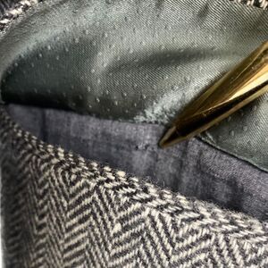 * The jacket is made of a luxurious blend of wool and Lambswool, and the tweed fabric type adds a touch of elegance to the overall look. The jacket has inner pockets for added convenience and a single-vented jacket vent style. It comes in a beautiful gray color with an herringbone pattern that adds a classic touch to any outfit.