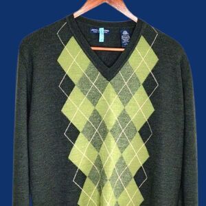John Ashford Sz LG Vintage Green Argyle Golf Sweater V-Neck Italian Merino Wool