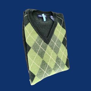 * Vintage Green Argyle Golf Pullover V Neck Italian Merino Wool Sweater