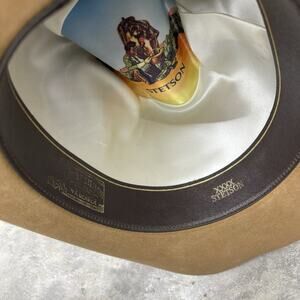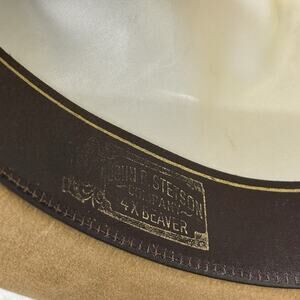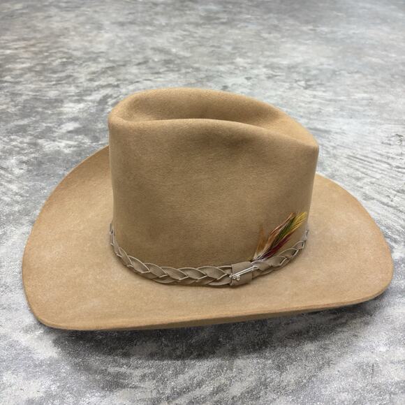 Stetson 4X Beaver cowboy hat with a braided band and feathers. In overall good pre owned condition. The shape of the hat is in excellent shape due to proper storage. There is a small mark on the inside brim shown in the photo the listing. It could also use a clean as there is some dustiness on the outside, but honestly I’m not sure if that’s how it’s supposed to be. Other than those few things the hat is still in good pre-owned condition. Selling as is and open to offers!