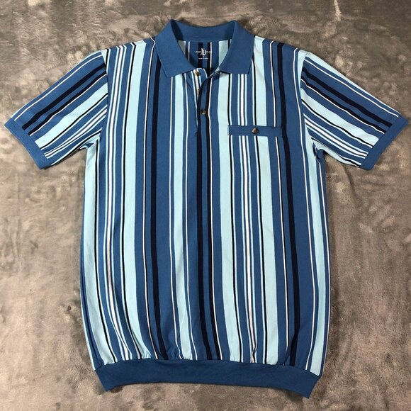 The John Blair Men's Polo Shirt in size Small is a retro-inspired vintage piece perfect for a hipster or preppy look. Featuring a striped blue color and a collared neckline, this short sleeve shirt is made of a comfortable cotton and polyester blend fabric with a knit texture. It is machine washable and designed for all seasons, making it versatile for various occasions such as travel, activewear, and casual outings. The banded waist and pocket detail add a stylish touch to this classic polo shirt from the brand John Blair. Excellent condition.