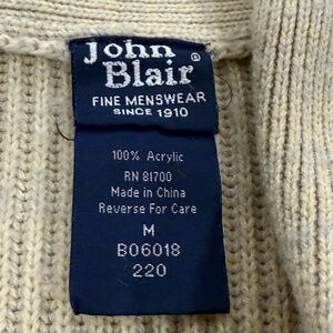 The John Blair Vintage Men's Cozy Cowl Collared Cardigan Sweater in Tan is a classic and stylish addition to any man's wardrobe. Made from acrylic material with a chunky-knit style, this sweater features a collared neck, long sleeves, and stylish accents like buttons. The vintage design adds a touch of nostalgia, while the regular fit and medium size make it suitable for casual occasions in the winter, fall, or spring seasons. With its timeless appeal and comfortable features, this cardigan is a versatile and charming choice for men looking for a classic and cozy sweater option. Sweater is in excellent, pre-loved condition!