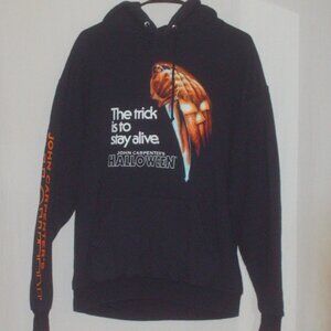 This is a very cool John Carpenter's Halloween movie double-sided hoodie - size large. Other approximate measurements: 22" pit to pit, elastic waist and 28" length. The Trick Is To Stay Alive. Great graphics on front and back and along the sleeve as well. Perfect. Great for the Halloween movie fan. Thanks for looking and please make an offer on anything you want.
