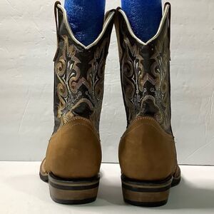 Made in Mexico Cognac brown lower leather, upper leather brown with embroidered detail, block 1” heel, normal wear, great condition.