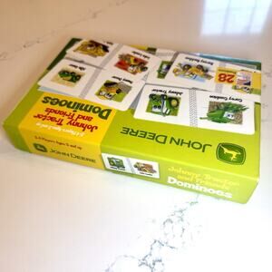 Add some farmyard fun to game night with this John Deere Johnny Tractor and Friends Dominoes set! A classic matching and strategy game featuring Johnny Tractor, Corey Combine, Danny Dozer, Allie Gator, Barney Backhoe, Luke Loader, and Eddie Excavator.