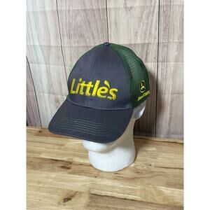The product is a John Deere Littles hat in adjustable adult size, featuring a green and gray color scheme with clear mesh panels. It is related to the theme of agriculture and is associated with the John Deere brand. This hat would be considered a collectible item and is likely used for advertising purposes.