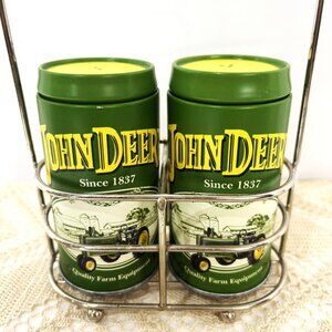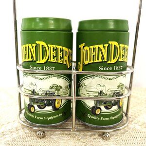 John Deere Metal Salt and Pepper Shaker Set w/ Caddy EUC