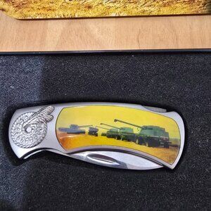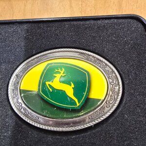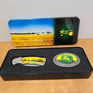 John Deere pocket knife and belt buckle set in collector tin. The knife has never been used and belt buckle is in excellent condition. The metal tin has some scratches.