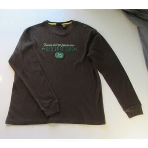 John Deere Men’s Thermal Waffle Knit Brown Shirt Large. Friends Don’t Let Friends Drive Red Tractors Grafic on Front. Measures 28.5 inches shoulder to hem and 24.5 inches arm pit to arm pit. No visible hole's rips or stains.