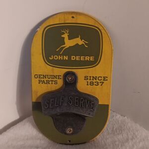 Vintage-style John Deere wall-mounted bottle opener. Features classic logo and 'Self Serve' design. Perfect for home bars or kitchens.