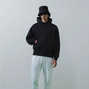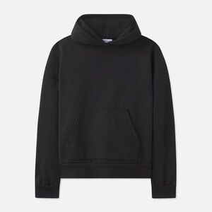Pullover hoodie in a classic, boxy and cropped fit. Super heavyweight 26 oz. terry with a soft fleeced backside. Reactive dye treatment for dark, solid coloration. Dropped shoulders. Kangaroo pocket at the waist. Rib knit waist and cuffs. Made in Los Angeles.