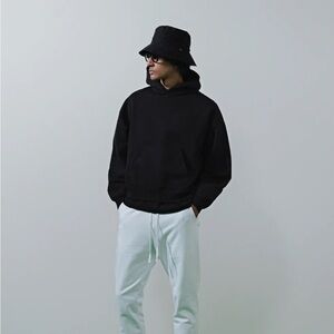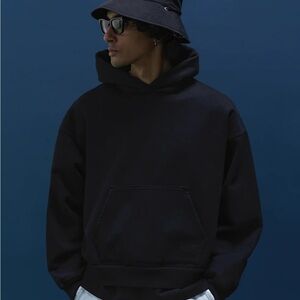Pullover hoodie in a classic, boxy and cropped fit. Super heavyweight 26 oz. terry with a soft fleeced backside. Reactive dye treatment for dark, solid coloration. Dropped shoulders. Kangaroo pocket at the waist. Rib knit waist and cuffs. Made in Los Angeles.