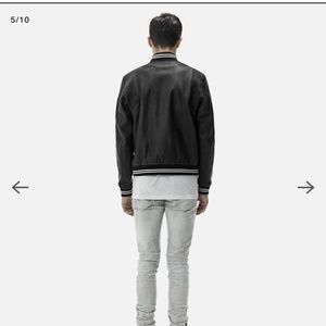 Classic leather stadium jacket with moto pleating at the shoulders, a snap button closure, two riri zip pockets, and two interior pockets, rib knit collar, cuffs, and waistband in striped black and white. Handcrafted by Blackmeans in Japan.