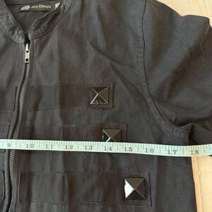 This John Eshaya jacket features a sleek black design with studded accents, providing a stylish edge. Ideal for professional settings or evening outings, it combines a classic silhouette with modern detailing. The soft material ensures comfort throughout wear, while the zip closure offers ease of use.