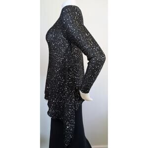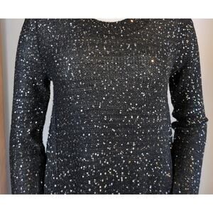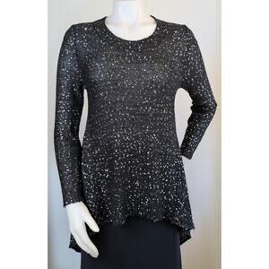 This is a John Fashion wool blend sweater in size Small. It features an allover black knit design embellished with shimmering sequins for a statement look. The silhouette is fitted through the top with a flowy waterfall side hems, giving it movement and a flattering drape. With its long sleeves and round neckline, this sweater combines cozy knitwear with evening-ready sparkle.