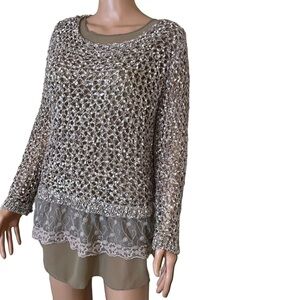 Metallic crochet sweater, sheer knit pullover, layered lace hem top, taupe camisole blouse, long sleeve open weave sweater, boho chic layering top, shimmer crochet knit, embroidered lace trim shirt, casual feminine blouse, textured fashion top