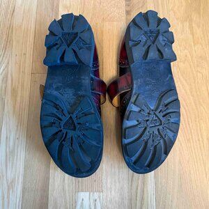 John Fluevog Angela shoe in “burgundy rub-off” color. Women’s size 11. These leather shoes have a lug sole. Like most Fluevogs, the “size 11” shoe is more like a size 10 or 10.5. The shoe is a true medium width, but it’s just a little bit short in the toe for a true size 11. My big toe hits the front of the shoe. I love these shoes and wish I could wear them, so I’d love for them to go to a good home. I’ve only worn them 2-3 times.