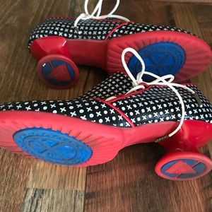 Stylish black heels with red accents. Unique pattern design. Comfortable and chic.