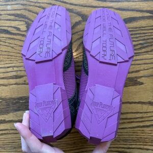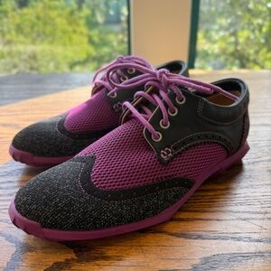 Super cute and unique Fluevog's. Fabric and leather combination. Slight wear on the soles and laces, but no other flaws. Pinkish purple and navy blue.