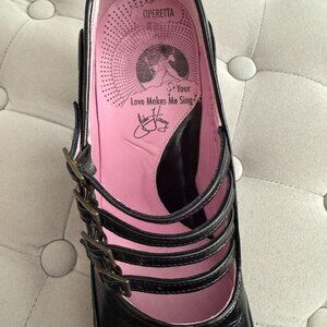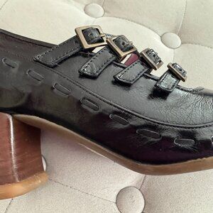 Lovely black leather 4-strap heels with decorative stitching around the perimeter