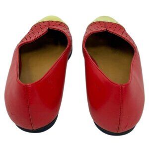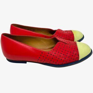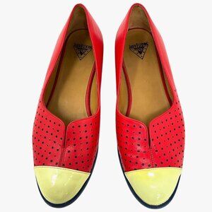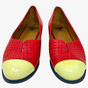John Fluevog Sue Flat Shoes Patent Toe Cap US Size 6 Red Yellow Perforated