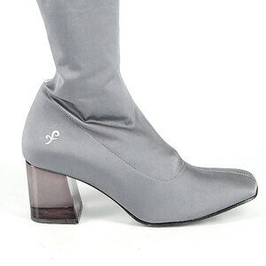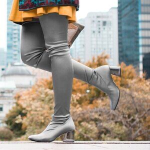 Cravings begone! The Petula is a pair of gasp-worthy thigh high boots that will feed your hunger for hot vegan fare. Mouthwatering Tasty Vogs crafted from the kind of metallic Italian stretch fabric you thought only existed in your dreams, these tall and triumphant treats feature an embroidered ‘f’, custom tunite soles and a 2.5" tinted acrylic heel. Good enough to eat.
