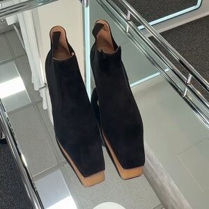 Black suede, pull on, square toe, curved heel