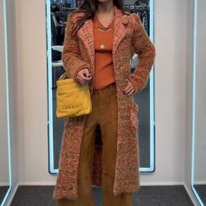 Multi colored with orange dominant, glitter thread accents, large leather buttons, long in length, pockets on front
