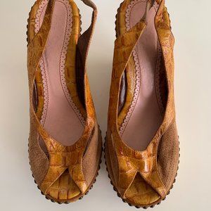 John Galliano Platform Slingback in good condition, size 8, Some thumbtacks are missing from one shoe, platform: 5 inches and 1.5 inches on the front