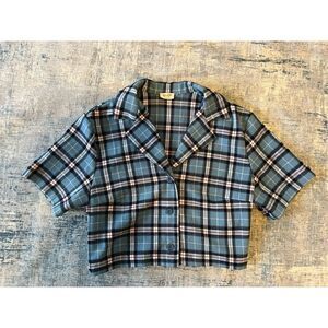 John Galt Blue Plaid Cropped Button Front Top One Size (XS / S)