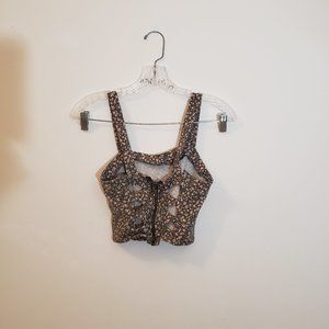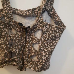 Gently worn greenish, pink, white, floral crop top. It has a zipper in the back and a caged cutout. Super Stretchy. It's super cute, but I haven't worn it in a while. No flaws or stains.