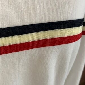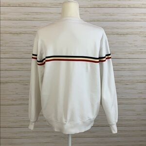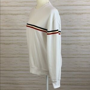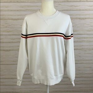 John Galt/Brandy Melville sweatshirt with stripe. White sweatshirt with an applied stripe in red, cream and navy. Very small stain on left sleeve, see photo. One size (fits most). Good used condition.