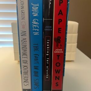 John Green paperback collection with multiple book covers. Features blue and white design. 4 book set.