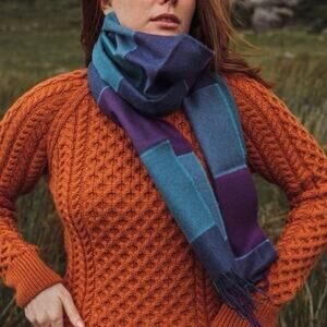 Merino Luxury Wool Scarf Blue Purple Mix Block Check. A vibrant and stylish collection that provides a beautiful mix of colours, patterns and is incredibly soft to the touch. 100% Fine Merino Brushed Wool.