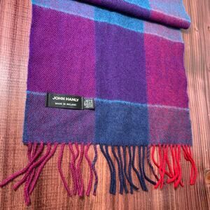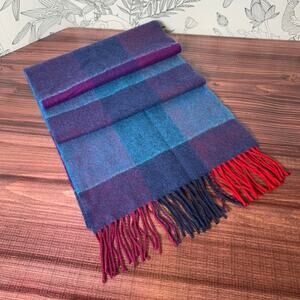 Unisex John Hanley Scarf, blue and purple block check, fringe hem, 100% extra fine merino wool, 70” including the trim, EUC!