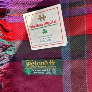 renowned Irish company that has been weaving wool products since 1893. They offer a variety of shawls and scarves crafted from natural fibers like lambswool and merino wool, known for their softness and warmth. This square 54” pure wool Shawl is a colorful plaid accessory, great for multiple seasons and is in perfect condition.