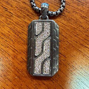 Sterling silver dog tag pendant featuring pavé-set white diamonds with carved chain-motif detailing. Comes on the original sterling silver box chain. A bold, high-quality statement piece with John Hardy’s signature hand-crafted finish. This is a luxury, artisan-made piece — elegant and versatile for everyday wear or layering.