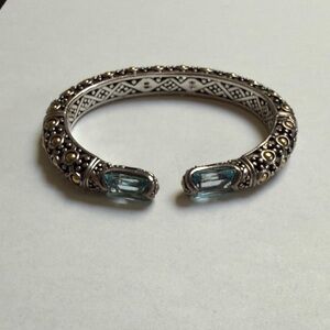 Elegant cuff bracelet with detailed 925 silver and 18k gold patterns with light blue topaz. Ideal for stylish wear.