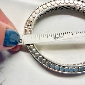 This exquisite silver bracelet by John Hardy showcases intricate metalwork with a delicate lattice design. The rigid bangle style is adorned with small stones along the edges, adding a touch of sparkle and elegance. Its timeless circular shape makes it a versatile piece for any occasion. Size M. About 6.75” inside circumference. Thickness is about 0.25”
