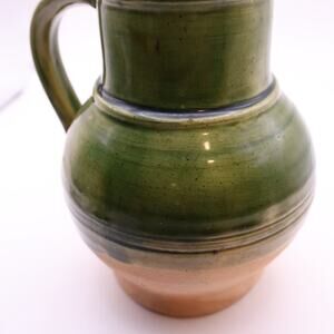 Bring the charm of traditional English craftsmanship to your home with this stunning vintage studio pottery jug by the renowned Yorkshire potter, John Hudson. This piece sourced in England embodies the classic folk art style, drawing inspiration from 17th-century English country pottery—a specialty for which Hudson is highly celebrated. The sturdy, bulbous form features a warm, natural terracotta/earthenware clay base that beautifully contrasts with the rich, glossy olive-green glaze covering the upper portion.