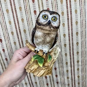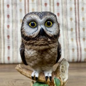 This 80s vintage ceramic owl figure stand about 6 inches tall, and is made of porcelain. It features a saw whet owl on a branch. The bottom has round felt or sponge like feet to protect the surface it’s sits on.