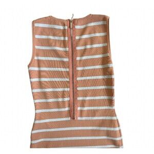 Peachy colored dress with white stripes , back zip closure , fitted style