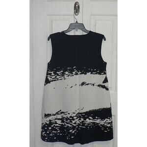 Elevate your wardrobe with the John + Jenn A-Line Sleeveless Knit Dress, a versatile piece that transitions effortlessly from day to night. The dress boasts an eye-catching black and white abstract print, a flattering round neckline, and a convenient pullover closure, making it a hassle-free addition to your ensemble. With its stretch fabric blend of nylon and viscose, it promises comfort and ease of movement throughout your busy day. Whether you're headed to the office or attending a casual gathering, this dress in size large fits the bill. It's sleeveless design makes it ideal for layering in cooler weather, while its short dress length keeps you cool in the summer. Carefully crafted to meet the demands of everyday wear yet chic enough for those special evenings out, this dress encapsulates contemporary style with a touch of designer flair.