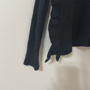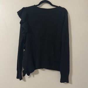 Elegant black sweater with textured design and ruffles down one side. Perfect for any occasion. Soft. V-neck.