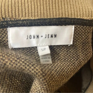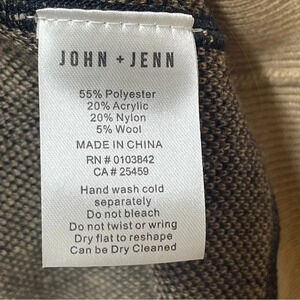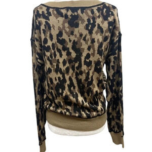 John + Jenn animal print crewneck long sleeved sweater. Size small. Solid camel band around collar, sleeves and bottom hem. Black, brown and tan abstract animal print on body and sleeves. Poly/acrylic/rayon/wool mix. Delicate wash cold.